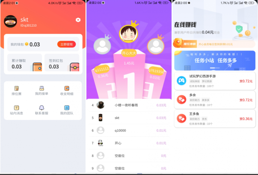 1.前端用户端:任务列表(支持筛选、排序)、任务详情(展示要求、奖励、截止时间)、接单操作、任务提交与审核、钱包(余额查看、提现申请)、消息通知(审核结果、提现进度);