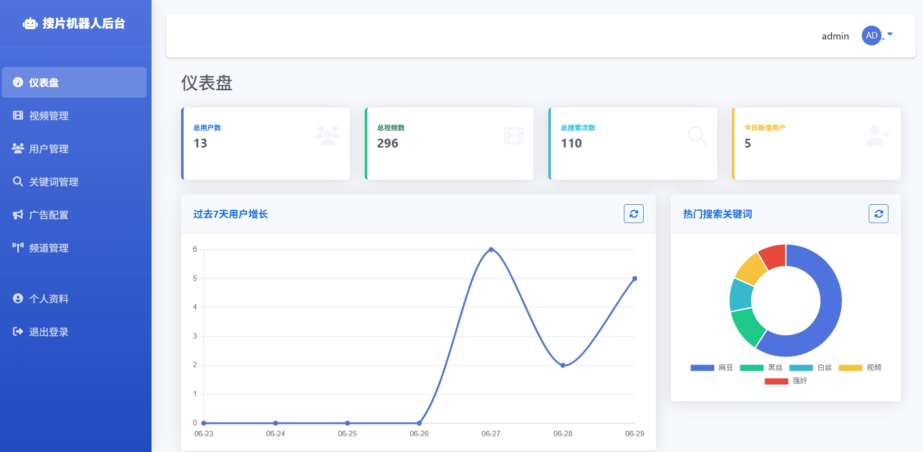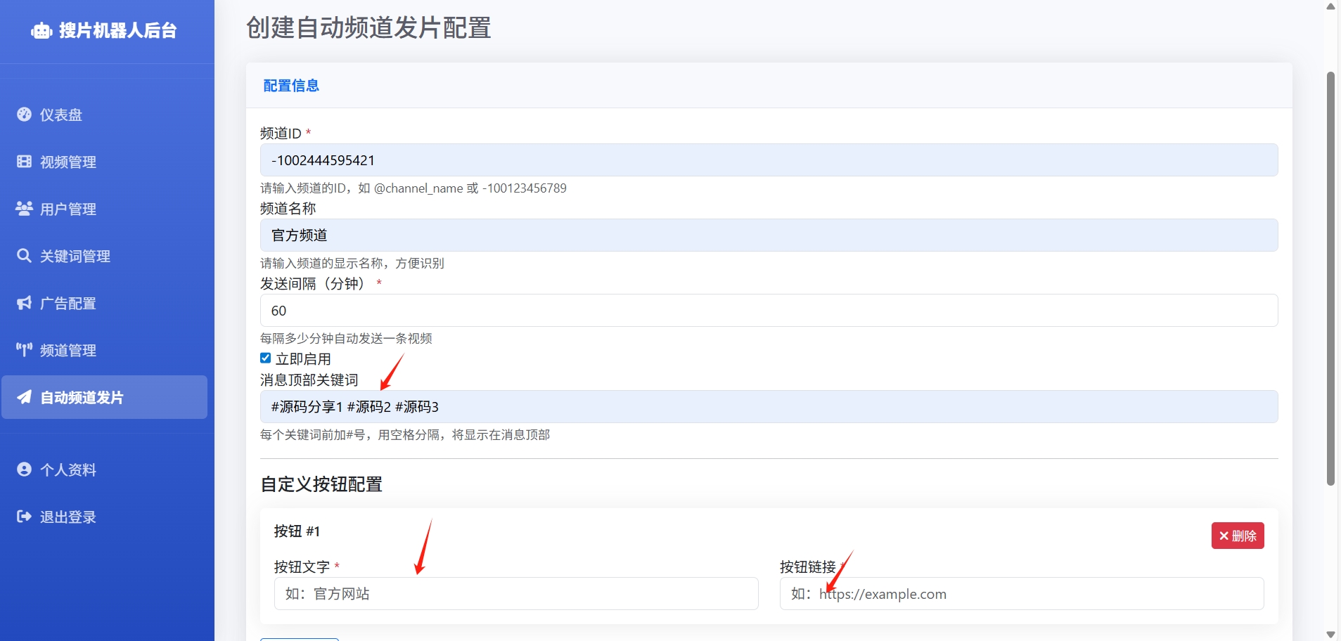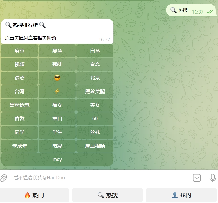 机器人关键词搜片/自动统计关键词/热门视频统计/翻页以及底部分类按钮/