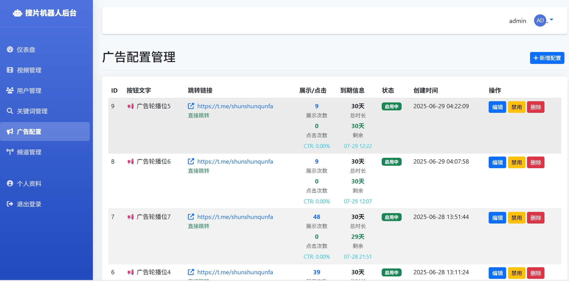 后台可设置机器人管理员  设置广告按钮  设置强制加入的频道信息