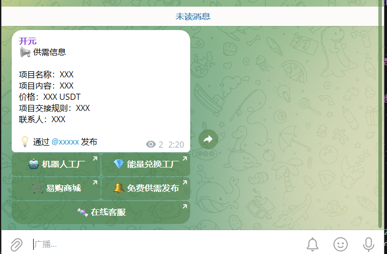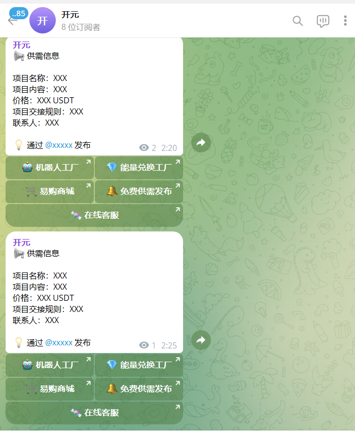 机器人可多频道和群组同步发布供需,也可以用于当做文章投稿机器人